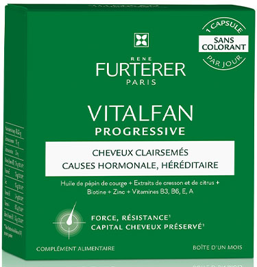 Este complemento alimenticio está formulado específicamente para luchar contra la caída del cabello progresiva, hormonal. El complemento anticaída progresiva del cabello Vitalfan combina activos de origen vegetal con vitaminas y minerales: